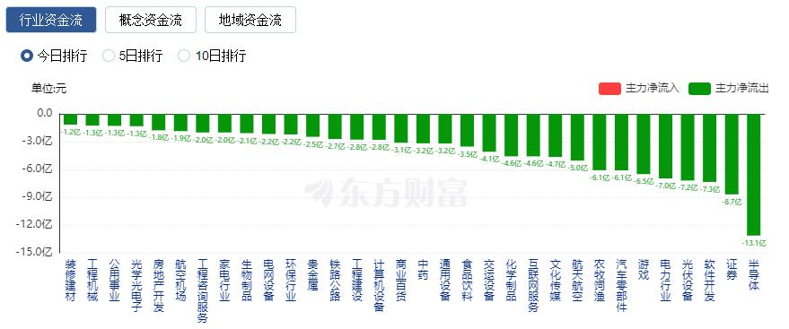 净流出方面,半导体、证券、软件开发等净流出排名靠前,其中半导体净流出13.14亿元。